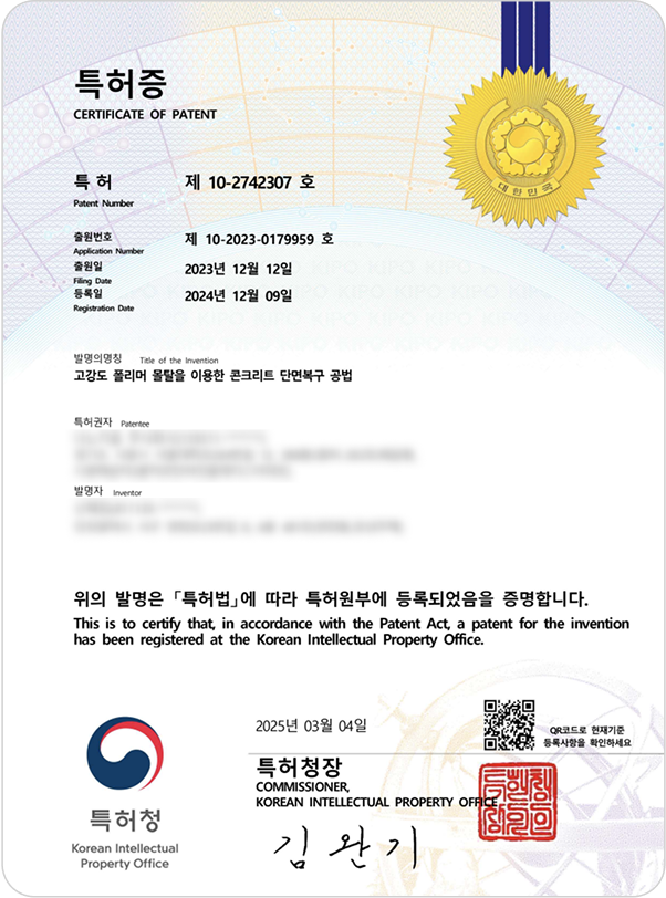 (고강도 폴리머 몰탈을 이용한 콘크리트 단면복구 공법 특허 제 10-2742307호)