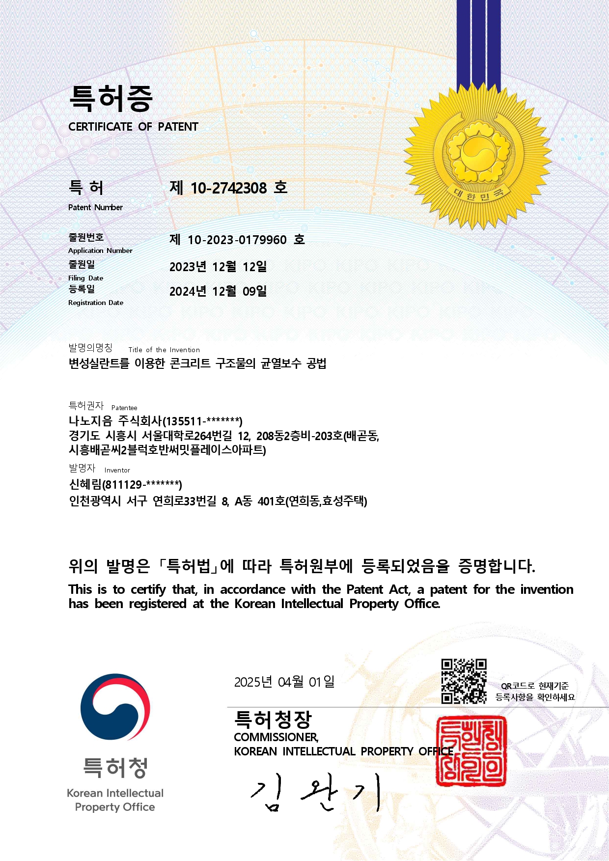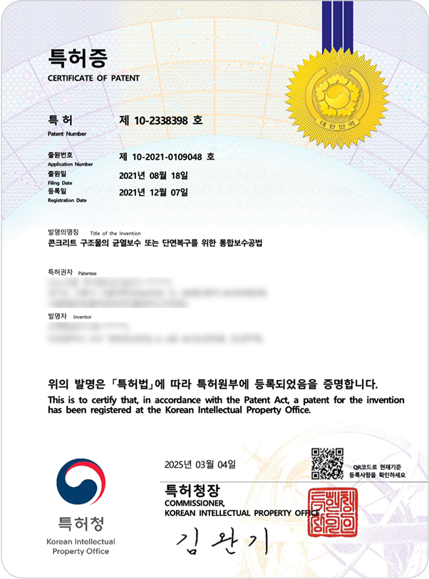 (콘크리트 구조물의 균열보수 또는 단면복구를 위한 통합보수공법 특허 제 10-2338398호)