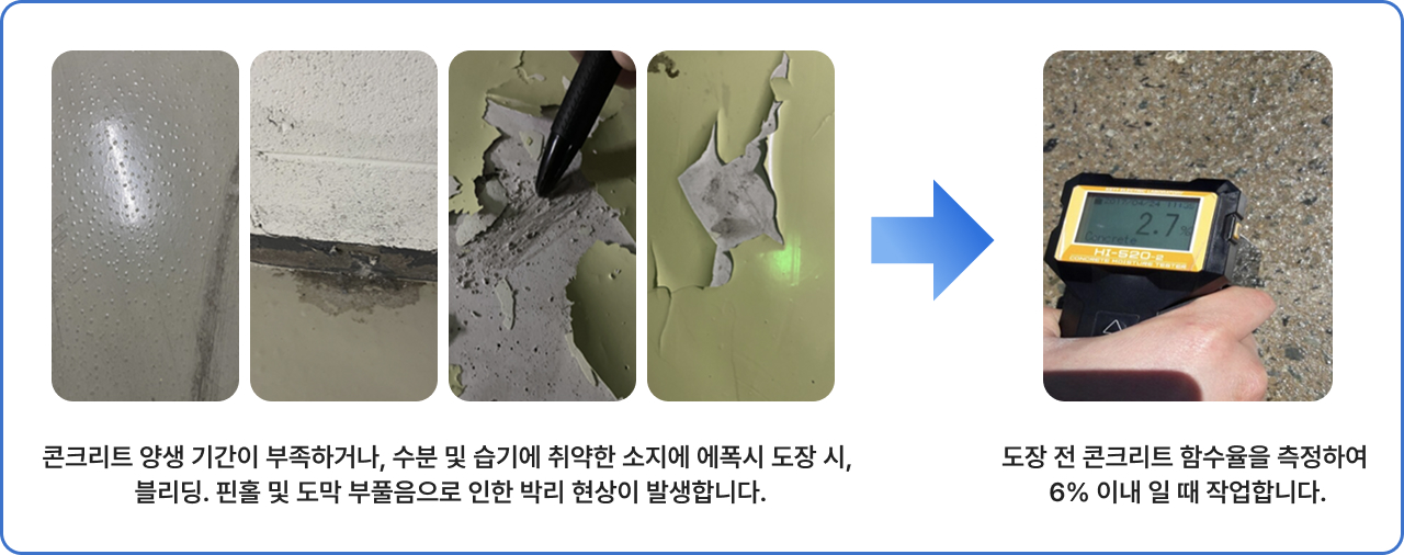도장면이 신축 콘크리트 및 몰탈면인 경우 충분히 양생 되어 pH 7~9 (20℃ 기준, 30일 이상 양생) 및 함수율이 6% 이하이며 레이턴스층이 충분히 제거되어야 합니다.
