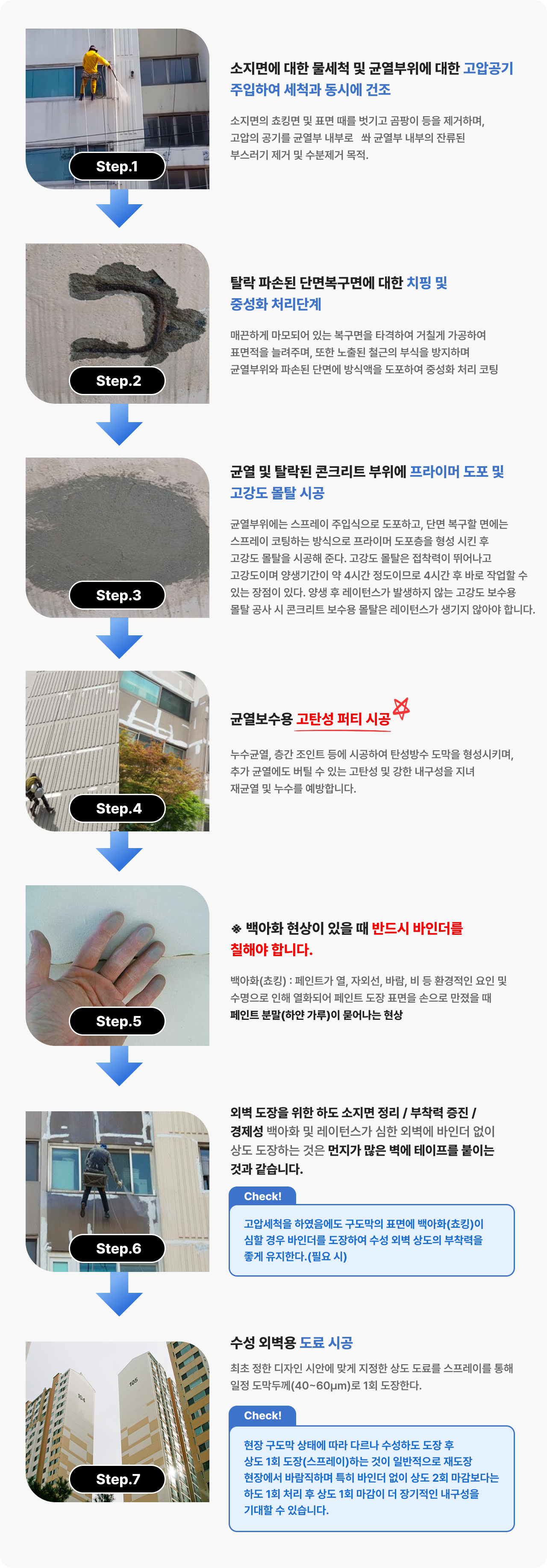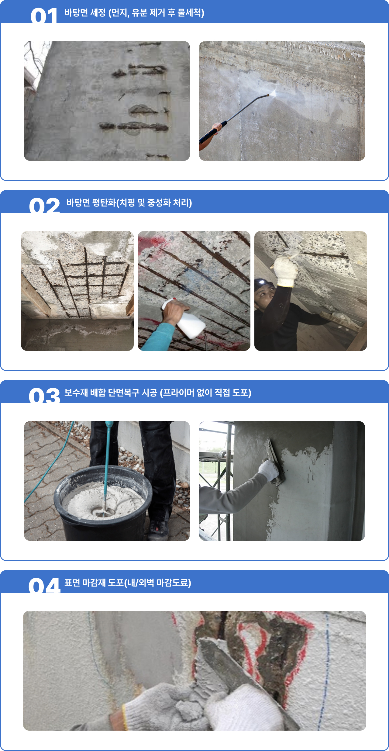 아파트 외벽 및 콘크리트 등에 보수 보강이 필요한 부위를 콘크리트 중성화처리제, 프라이머 도포제, 단면복구 메움재(고강도 몰탈), 표면마감재를 이용하여 균열보수 및 단면복구를 위한 통합보수 공법