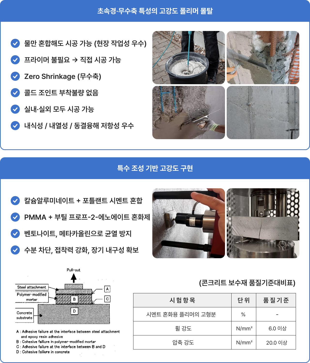고성능 콘크리트 단면보수 · 보강용 몰탈은 수경성 시멘트와 고성능 팽창시멘트, 고품위 규사, a-반수석고,폴리머 및 특수 첨가제의 혼합물로 이우어져 있습니다. 즉, 특수하게 제조된 팽창시멘트와 a-반수석고가 최적으로 배합되어 있어 무수축(non-shrinkage)및 속경성과 항균/방청기능이 추가된 보수 보강용 몰탈 제품 입니다.