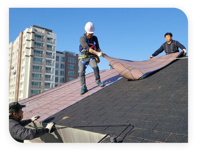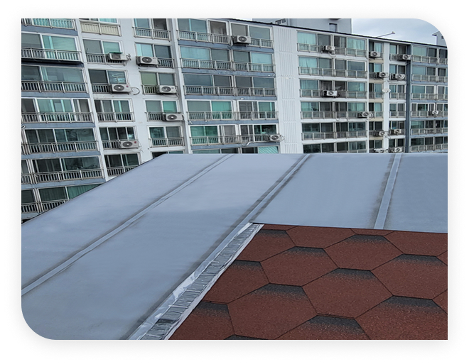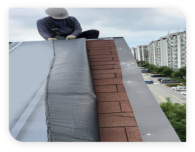 - 기존 슁글 탈락 부분 및 바탕면 보수 작업으로 시트 접착력 및 평활도 유지