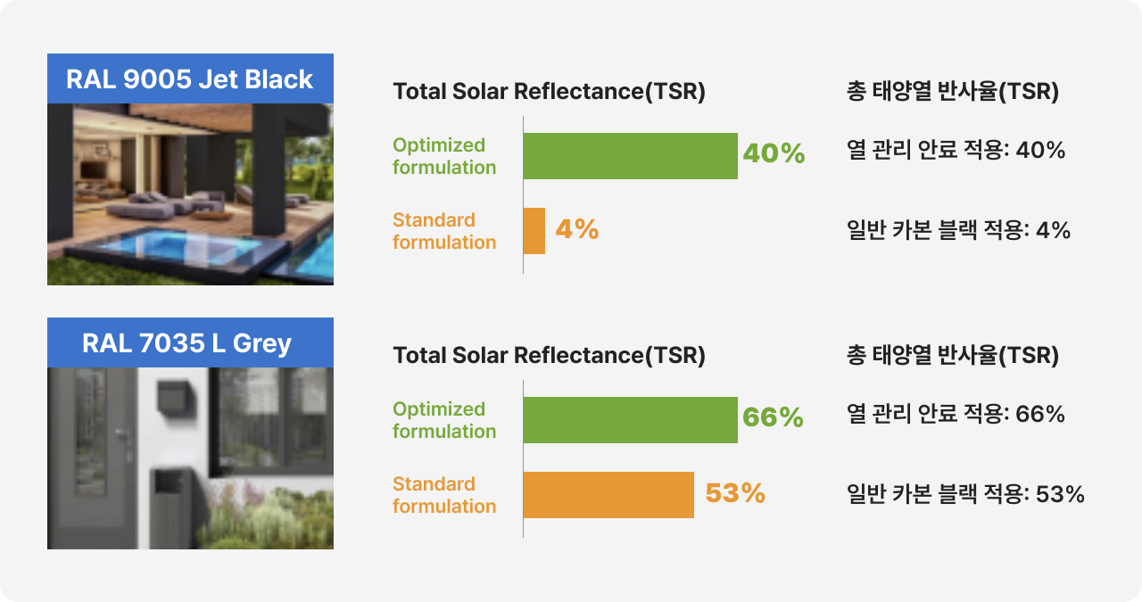 태양 복사열의 약 50%가 지표면에 흡수. 검은색 표면은 일반적으로 이 에너지의 최대 90%를 흡수하여 온도가 높아지지만, 흰색 표면은 최대 25%만 흡수하고 훨씬 더 차가운 상태를 유지하는 경향이 있음. 하지만 흰색이 항상 선택 가능한 것은 아니며, 색상, 특히 어두운 색조가 요구되거나 심지어 필요한 경우 열 관리 안료를 사용하여 다른 검정색 안료에 비해 근적외선(NIR) 태양광 스펙트럼에서 가장 적은 에너지를 흡수.