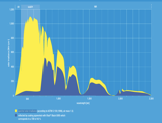 노란색 구역은 분광형 태양 복사 조도로 청색 구역의 열관리 블랙 안료가 태양광 적외선 영역(700~2500mm)의 빛을 반사하고 열전달을 방해하여 회색을 구현하더라도 반사율을 높여 표면온도를 낮추는 효과.