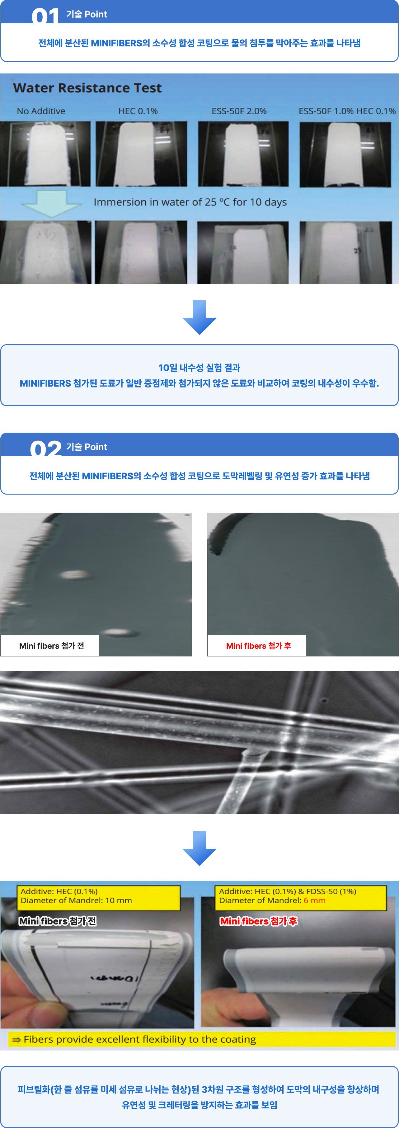 폴리에스테르와 같은 일반 합성섬유는 1차원 막대모양이나, 피브릴화 (한 줄 섬유를 미세 섬유로 나뉘는 현상)된 3차원 구조의 고밀도 폴리에틸렌(HDPE) 섬유 형태로 조밀한 형태를 구성하여 도료내에 분산되어 도막으로의 수분 침투를 억제하며, 3차원 구조로 높은 표면적은 고농도 도료의 침전을 예방하는 신조재 입니다.