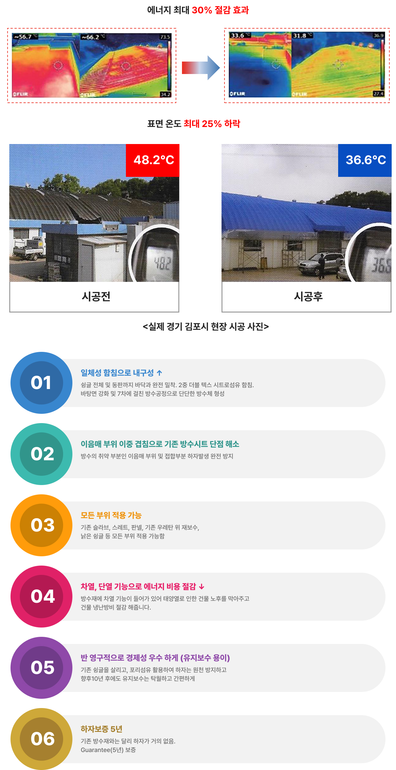 태양열에 의한 건축물 온도 상승을 방지하여 차열 특성을 강화시키는 복합시트 공법으로 방수기능이 들어가 있는 3layer 시트와 차열 강화 방수재를 이용하는 공법으로 건축물의 크랙, 박리 현상을 막아주고 더 나아가 건축물의 수명을 연장시켜준다.