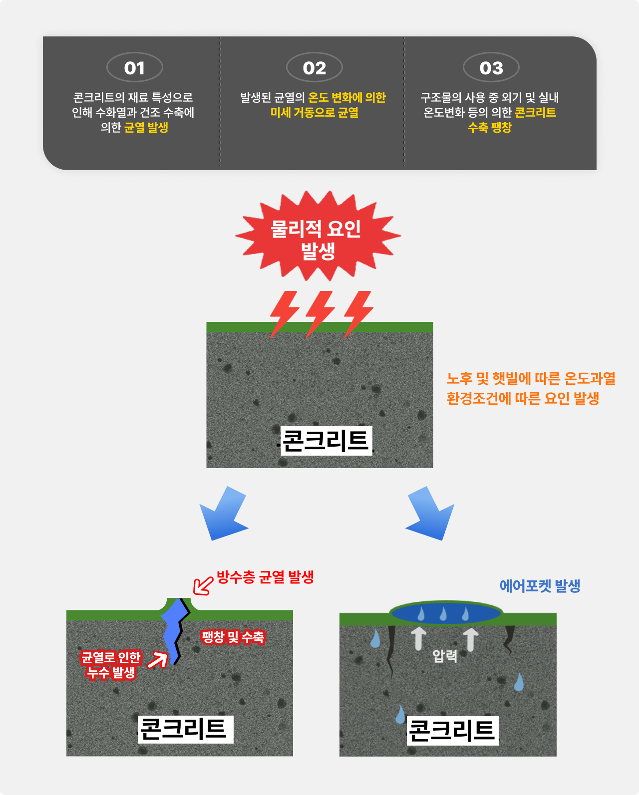 지구온난화로 인한 극심한 기후변화. 방수층의 끝없는 수축, 팽창 반복으로 누수 발생